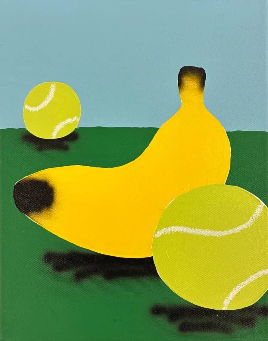 AcheterPeinture réalisée par l'artiste David Bruce et exposée pour la Buronzu Gallery lors de l'Affordable Art Fair à Bruxelles. Passionné par le graffiti, David Bruce s'installe à Liège où il réalise des oeuvres liés à ses souvenirs, comme le basket. Il utilise des couleurs vives et des objets du quotidien, comme des bananes ou des smileys.